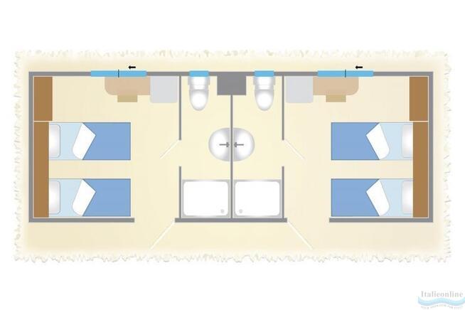 dvěma lůžky dole a třetím nad nimi, koupelna s WC a sprchou, WC,
