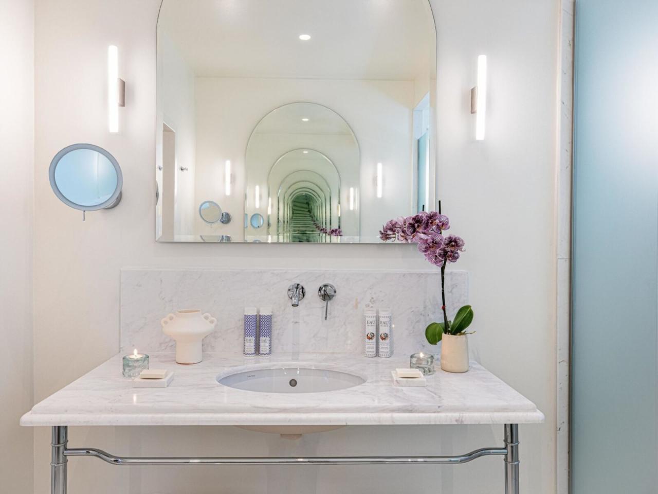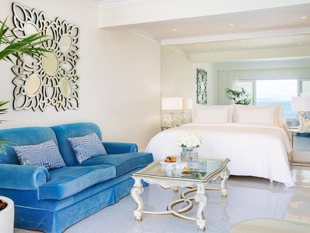 lůžkem a oddělený obývací pokoj s pohovkami, dvě koupelny s WC,