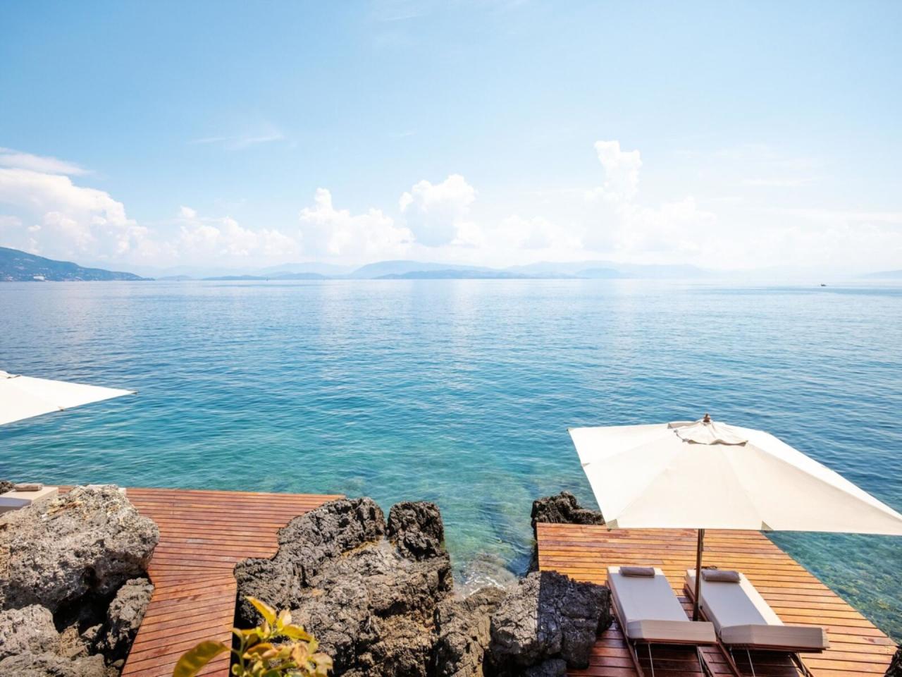 Korfu, má ideální polohu u třech soukromých písčito-oblázkových