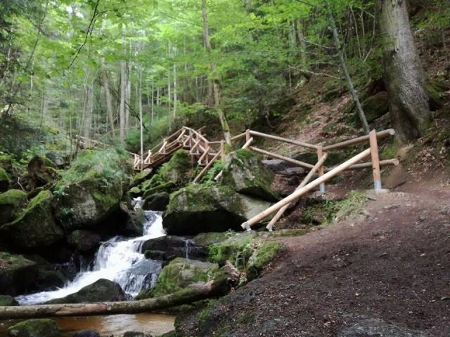 dřevěných schodech a můstcích kolem vodopádů a hlubokých tůní.